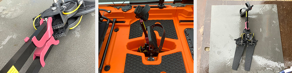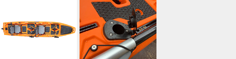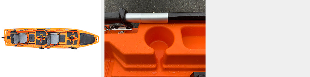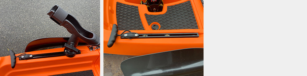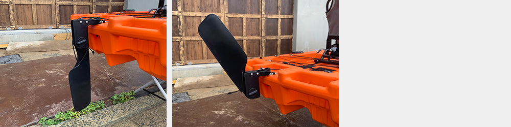 カヤックの方向を変える時、手漕ぎカヤックはパドルでできますが、足漕ぎの場合はラダーしかありません。なのでこのラダーは大変重要なパーツとなります。カヤックのラダーにはいろんなタイプがあります。底に固定式の場合海への出し入れの際、常にラダーが干渉し、いずれ壊れてしまします。 またサイズが小さい、長くても幅が狭いラダーは、極端に反応が悪くなります。 特に2人乗りの場合、とても反応が鈍くなります。DFK TRANSFORMERSのラダーは跳ね上げ式のため海に出てから下すことができ、上がる時に跳ね上げを忘れていてもバネにより深さに合わせて持ち上がります。 ラダー操作はシートの左サイドにあるレバーの操作で行います。また、こだわりはこのラダーの長さと幅にあります。速度が遅いカヤックではこれが重要!長くて幅広のラダーは、回転性と反応の速さ直進性が抜群に良くなります。
