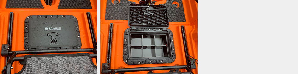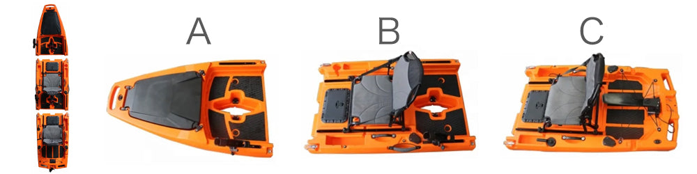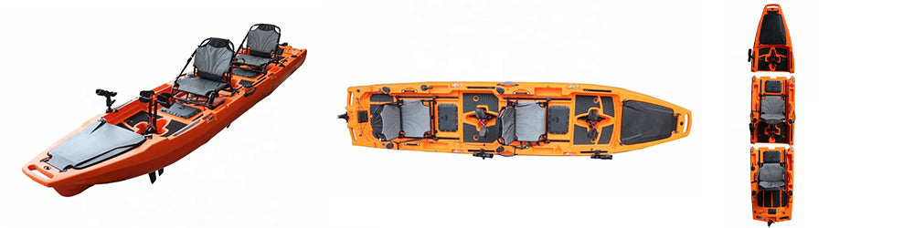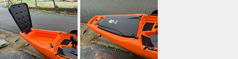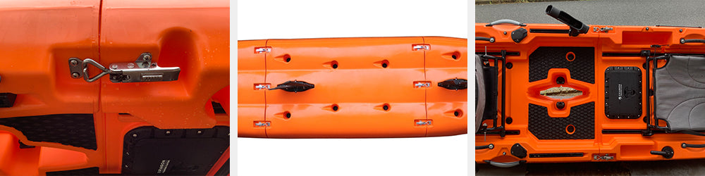その名の通り分解、変形することができ、ある時は1人乗り、ある時は2人乗り、そして車への積み込みや保管時は分割することができます。この手の分割式はこれまでもいくつか出回っていますが、接続部分やロックレバーに大変な負荷がかかるため耐久性に問題がありました。このDFK TRANSFORMERSはその接続部分に改良を重ねてついに完成いたしました。接続レバーにはステンレスレバーを採用し上部2か所、下部3か所でガッチリと固定。お好きな時に、お好きな場所で、お好きなお友達と、最高のカヤックフィッシングをお楽しみください。