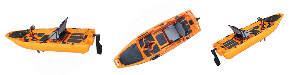 DFK TRANSFORMERSはフィンドライブを採用した直進性と安定性、スピードを兼ね備えた理想的なFISHINGカヤックです。このドライブの特徴は言わば足ひれをバタバタするようなシステムです。 回転ではなく、右、左、と交互に踏み込むことにより、推進力につながるシンプルな構造で、本体が樹脂製なので驚くほど軽量となっています。取り外しもワンタッチでとても簡単。足の長さにペダルの位置を調整する時は、ドライブの根本にあるボタンを押すことで7段階の位置に動かすことができます。 さらに浅瀬を通る時は岩に当たらないようにフィンをボトムに張り付けるようにしてパタパタと進むこともできます。スピードはプロペラ式とほぼ同等ですが、バックは出来ません。 パドル式に比べ、移動時に食事をしたり、写真を撮ったり、魚探を見たり地図を見たり、そんなことができるのはやはり足漕ぎの魅力です。長距離、長時間の動きも足漕ぎが有利です。