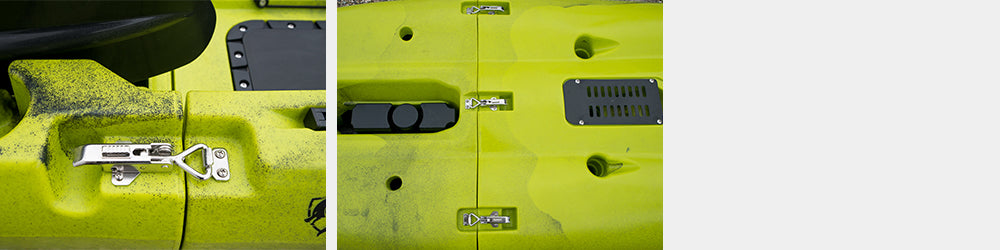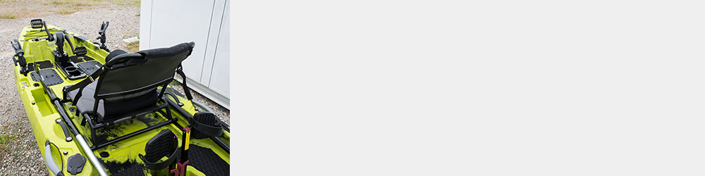 カヤックの方向を変える時、手漕ぎカヤックはパドルでできますが、足漕ぎの場合はラダーしかありません。足漕ぎカヤックにとって、このラダーは大変重要なパーツとなります。カヤックのラダーにはいろんなタイプがあります。底に固定式の場合海への出し入れの際、常にラダーが干渉し、いずれ壊れてしまします。 またサイズが小さい、長くても幅が狭いラダーは、極端に反応が悪くなります。 特に2人乗りの場合、とても反応が鈍くなります。DFK TRANSFORMERSのラダーは跳ね上げ式のため海に出てから下すことができ、上がる時に跳ね上げを忘れていてもバネにより深さに合わせて持ち上がります。 ラダー操作はシートの左サイドにあるレバーの操作で行います。また、こだわりはこのラダーの長さと幅にあります。速度が遅いカヤックではこれが重要!長くて幅広のラダーは、回転性と反応の速さ直進性が抜群に良くなります。