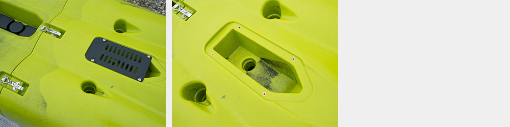 前部分のデッキ上のスクエアハッチは3つ付いており前部両サイドには生き餌等の生け簀としても使えるようになっています