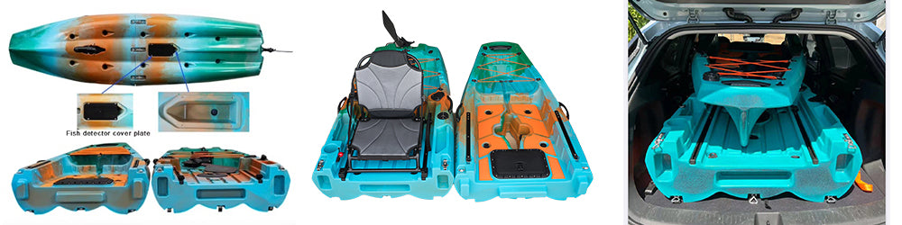 まずこのカヤックの大きな特徴は ① 2分割できること、 ②抜群の安定性と回転性能、直進性を併せ持っていること ③ 3種類のドライブを使用できることです