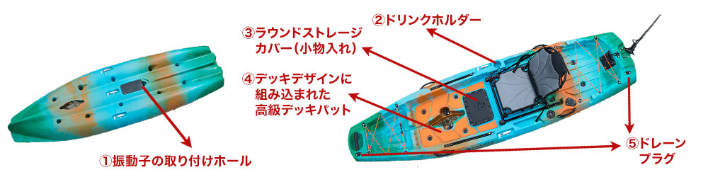 まずこのモデル全長が290cm 幅は830cmですので、ちょっと短くて、幅も狭いと心配しましたが、乗ってみて全く問題はありませんでした。 この性能が出せるのであれば小さいほうがメリットは多いと思います。 なぜこの性能が出せるのか? まず安定性能を出すのは、ボトムがふっくらとした双胴ボトムである事、テールが直線的であることがその理由なのです これまでのカヤックはテールを尖らせたものが多かったのですが、これだと回転性は良いのですがふらついて安定性に欠けます。 テールの直線は大きく安定性をもたらすのです。 全体的なバランスが良いのでロングモデルと比べても、290cmなのにスピードも全く問題ありません。 次になんで回転性と直進性が良いのか? それはビッグラダーにあります。 カヤックはスピードが出ないのでラダーの幅は広くないと舵の効きが悪いのですが、この290シリーズは大きなラダーが標準装備されています。これにより、直進性と回転性の両立が出来るのです ちなみにこのラダーによりさらに驚く性能があります それはドテラ流しの際、ラダー操作でノーズを上にしたり、テールを上にしたり、カヤックの向きを変えることができるのです。 これはフィッシング中とても役に立つ性能です そして、DFKが推奨している風が強い時でも流されないで釣りができる「漕ぎ釣り」もとてもやりやすいのです