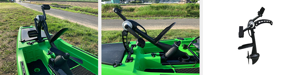 DORAGON EYEはプロペラドライブを採用した直進性と安定性、スピードを兼ね備えた理想的なフィッシングカヤック。このドライブの特徴は自転車と同じようにペダルを回転させてプロペラを回すシステム。最新式のプロペラドライブで従来のものに比べて負荷が軽く疲れにくい、フレームも可動式でバックもできるのが特徴です。パドル式に比べ、移動時に食事をしたり、写真を撮ったり、魚探を見たり地図を見たり、そんなことができるのはやはり足漕ぎの魅力。長距離、長時間の動きも足漕ぎが有利です。