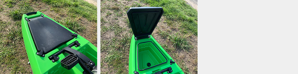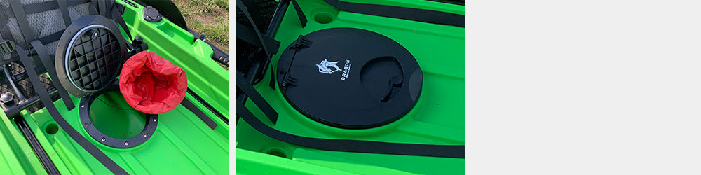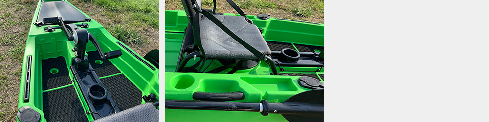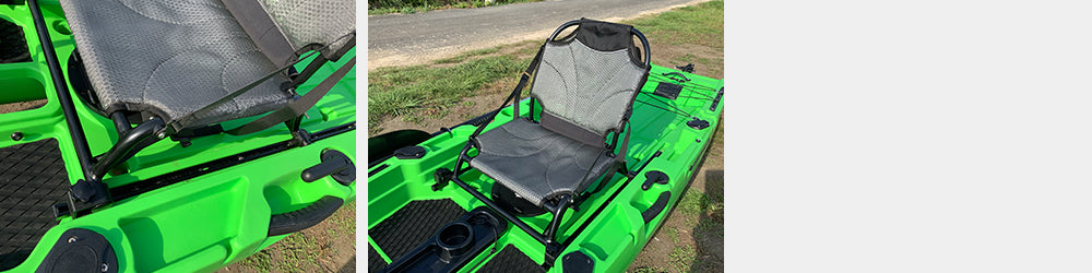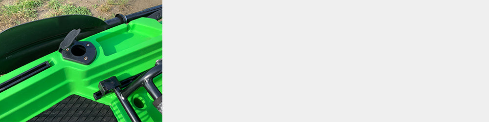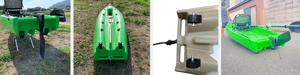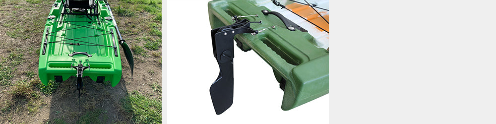 カヤックの方向を変える時、手漕ぎカヤックはパドルでできますが、足漕ぎの場合はラダーしかありません。なのでこのラダーは大変重要なパーツとなります。カヤックのラダーにはいろんなタイプがあります。底に固定式の場合海への出し入れの際、常にラダーが干渉し、いずれ壊れてしまします。 またサイズが小さい、長くても幅が狭いラダーは、極端に反応が悪くなります。 DORAGON EYEのラダーは跳ね上げ式のため海に出てから下すことができ、上がる時に跳ね上げを忘れていてもバネにより深さに合わせて持ち上がります。ラダー操作はシートの左サイドにあるレバーの操作で行います。また、こだわりはこのラダーの長さと幅にあります。速度が遅いカヤックではこれが重要!長くて幅広のラダーは、回転性と反応の速さ直進性が抜群に良くなります。