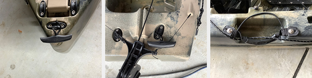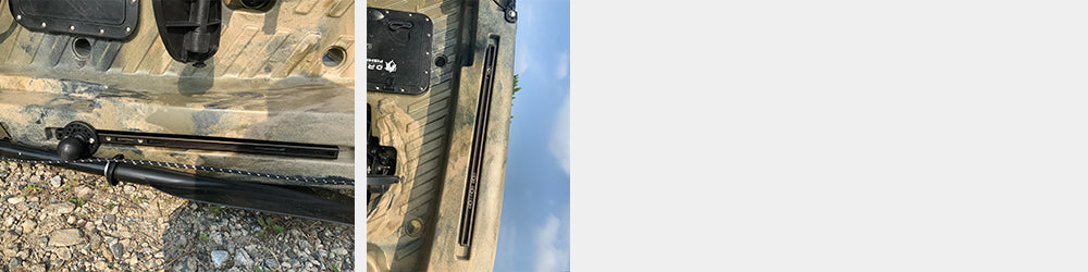 このドライブの特徴は言わば足ひれをバタバタするようなシステムです。回転ではなく 右、左、と交互に踏み込むことにより、推進力につながるシンプルな構造で、本体が樹脂製なので驚くほど軽量となっています。取り外しもワンタッチでとても簡単。足の長さにペダルの位置を調整する時は、ドライブの根本にあるボタンを押すことで7段階の位置に動かすことができます。さらに浅瀬を通る時は岩に当たらないようにフィンをボトムに張り付けるようにしてパタパタと進むこともできます。スピードはプロペラ式とほぼ同等ですが、バックは出来ません。