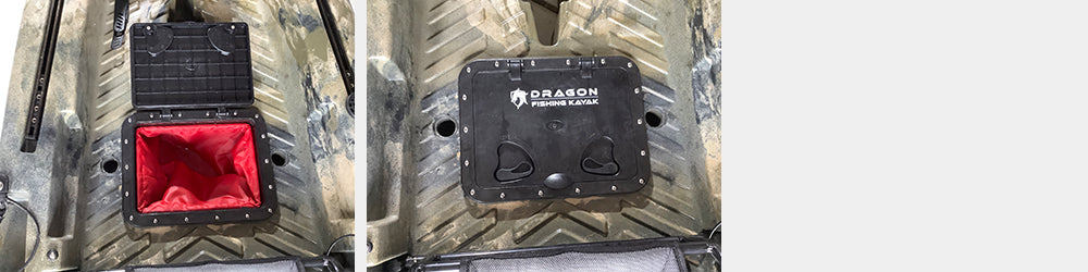 カヤックの方向を変える時、手漕ぎカヤックはパドルでできますが、足漕ぎの場合はラダーしかありません。なのでこのラダーは大変重要なパーツとなります。カヤックのラダーにはいろんなタイプがあります。底に固定式の場合海への出し入れの際、常にラダーが干渉し、いずれ壊れてしまします。 またサイズが小さい、長くても幅が狭いラダーは、極端に反応が悪くなります。 DORAGON FLYのラダーは跳ね上げ式のため海に出てから下すことができ、上がる時に跳ね上げを忘れていてもバネにより深さに合わせて持ち上がります。 ラダー操作はシート左にあるレバーで行います。 また、こだわりはこのラダーの長さと幅にあります。速度が遅いカヤックではこれが重要!長くて幅広のラダーは、回転性と反応の速さ直進性が抜群に良くなります。
